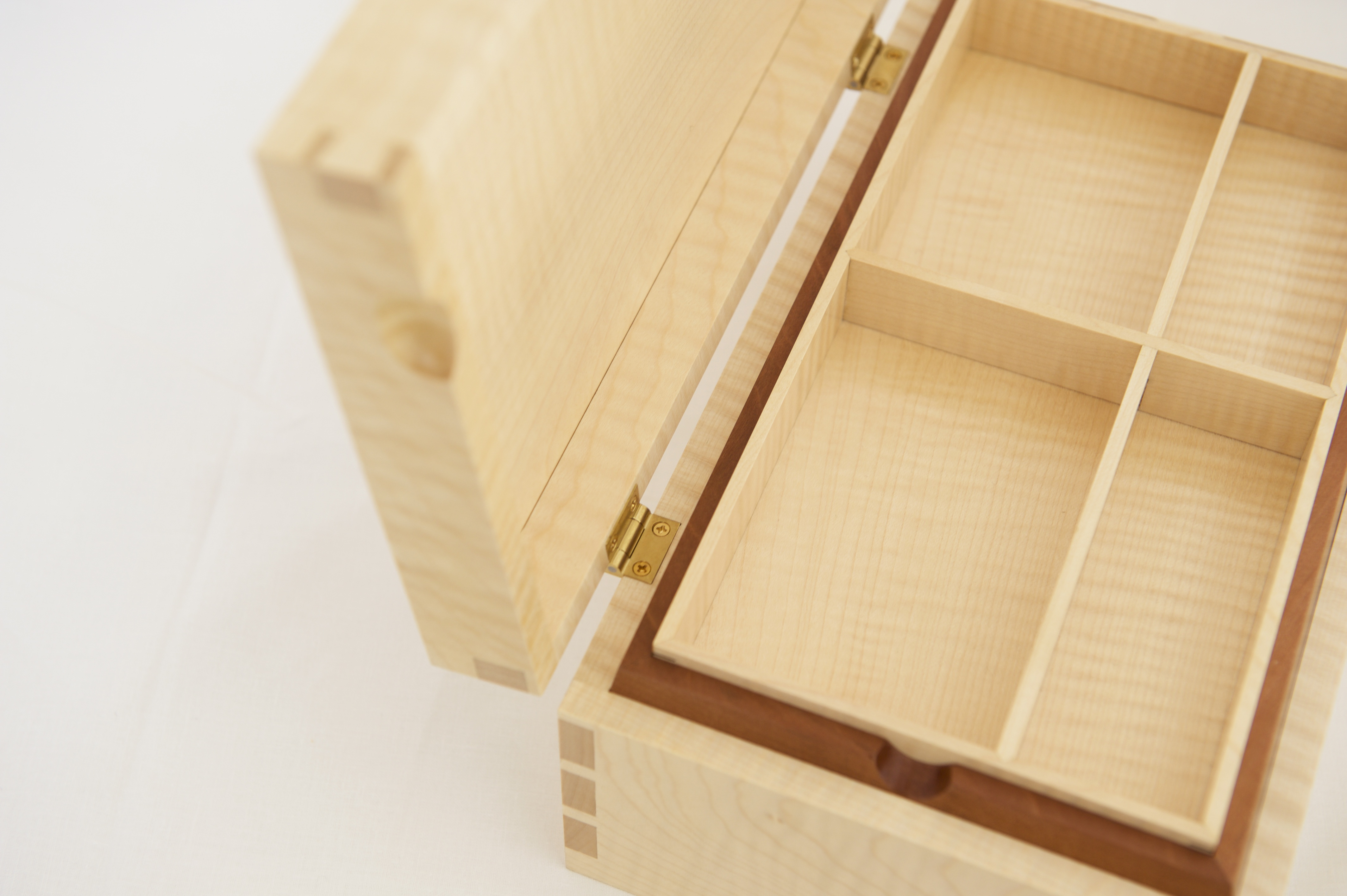 Jewellery boxes should be echoes of the quality of the products they contain, and it’s the small details that subconsciously add up to give the total effect of visual titillation as the eye dances across the French polish, the clean dovetails, the snug brass hinges. And then there are the invisible details too, such as the piston-fit of the tray that allows it to lower soundlessly on a cushion of air, and the chamfer on the liners that softens the lid’s fall. The box is made from ripple sycamore which, as the name suggests, has a grain that gives a holographic texture. The bottom and liners are made from air-dried English pear wood which is exquisite to work with, coming off the plane blade like chocolate. The finish is shellac and wax on all interior surfaces, and a full French polish on all exterior surfaces.
