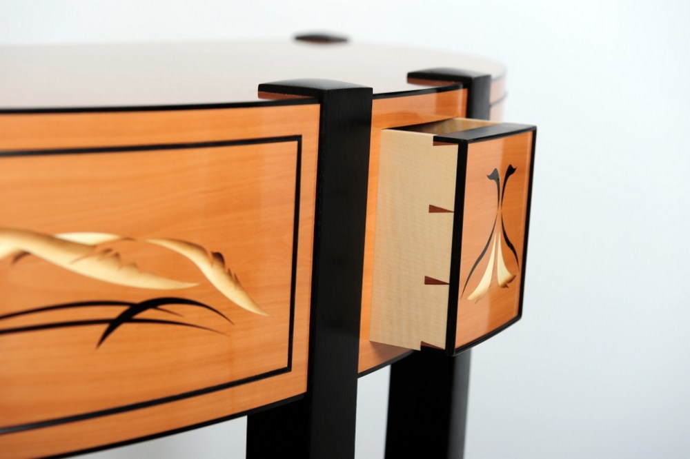 August 1, 2015 Designs 1024 × 682 Black Swan bespoke contemporary side table console design by Paul Chilton A piston fitted ‘secret’ drawer made from solid, air-dried English pear woord and rippled sycamore, with a solid ebony bead framing the central marquetry panel. Like Loading...